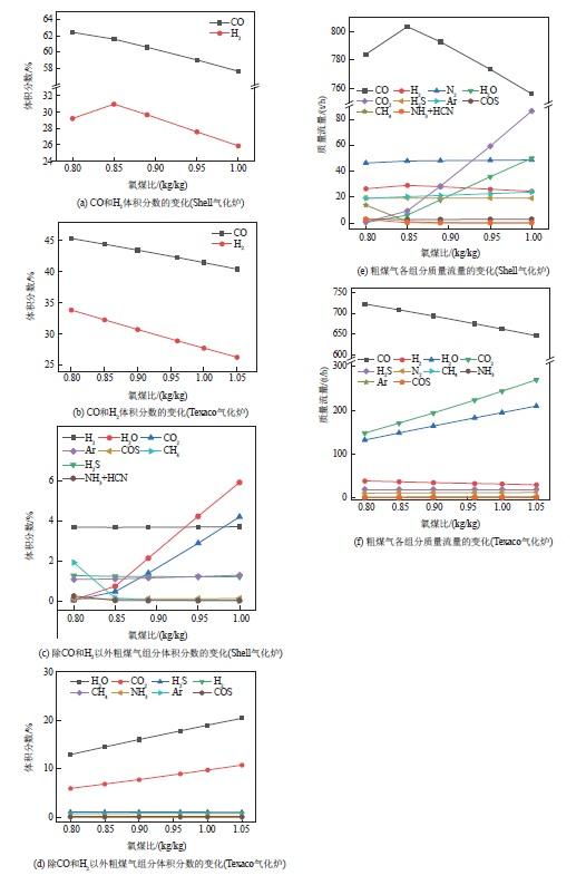 在模型中保持煤的输入量不变,令氧煤比在设计数据的附近波动,Shell气化炉的设计氧煤比为0.89,波动范围为0.80~1.00,Texaco气化炉的设计氧煤比为0.96,波动范围为0.80~1.05。图2为氧煤比变化对合成气组分和产量的影响,可以看出,氧煤比对粗煤气主要成分(CO、H2、H2O、CO2)产量的影响非常显著,随着氧煤比增大,粗煤气中的CO与H2量呈先增大后减小的趋势,氧煤比有比较明显的理论最优值,这是因为煤气化反应本质上是煤的部分氧化反应,氧煤比较小时氧气不足,气化反应未能充分进行,氧煤比较大时氧气过多,碳元素和氢元素被彻底氧化为CO2和H2O。从模拟结果来看,Shell气化炉的最佳氧煤比在0.85左右,Texaco气化炉合成气有效成分产量最高的点没有出现在0.80~1.05的范围内,而应该在0.80以下,结合气化炉型式考虑,水煤浆气化炉由于携带煤粉投入气化炉大量的水,这些水也起到了氧化剂的作用,但是氧气不足也会影响气化反应初期的燃烧放热过程,而燃烧过程没有在本文建立的模型中有所体现,所以出现了水煤浆气化炉最佳氧煤比较低的结果。