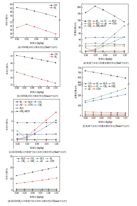 | 图2 氧煤比对粗煤气组分和质量流量的影响 |