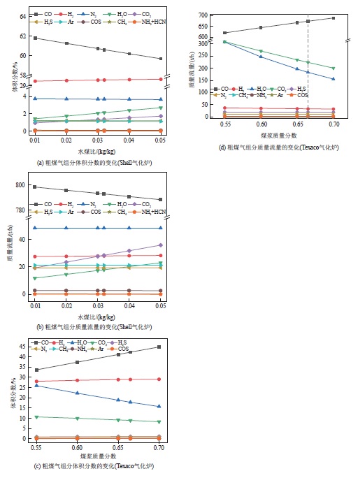 | 图3 水煤比对粗煤气组分和质量流量的影响 |