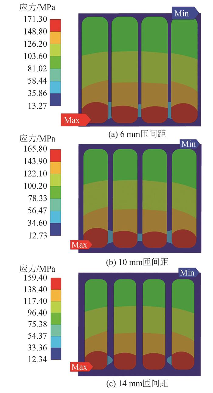 2)适当增加导体匝间距可以降低导体内表面附近的磁感应强度,当匝间距离由6 mm增加至14 mm时,导体最大等效应力从171 MPa降至160 MPa,降幅6.4%。
