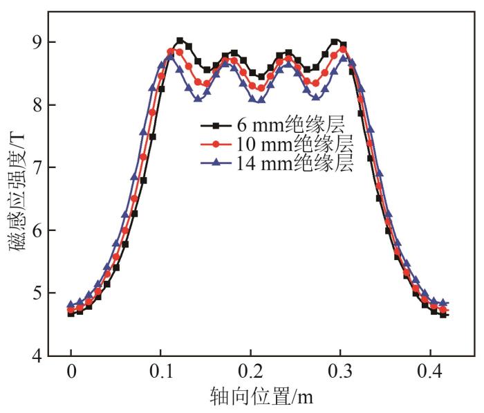 由图9可以看出,随着匝间距的增加,导体附近各轴向位置下的磁感应强度均有明显下降,由此使得导体的最大等效应力降低。因此在后续磁体设计中,导体的匝间距可以考虑在允许的范围内适当增加。