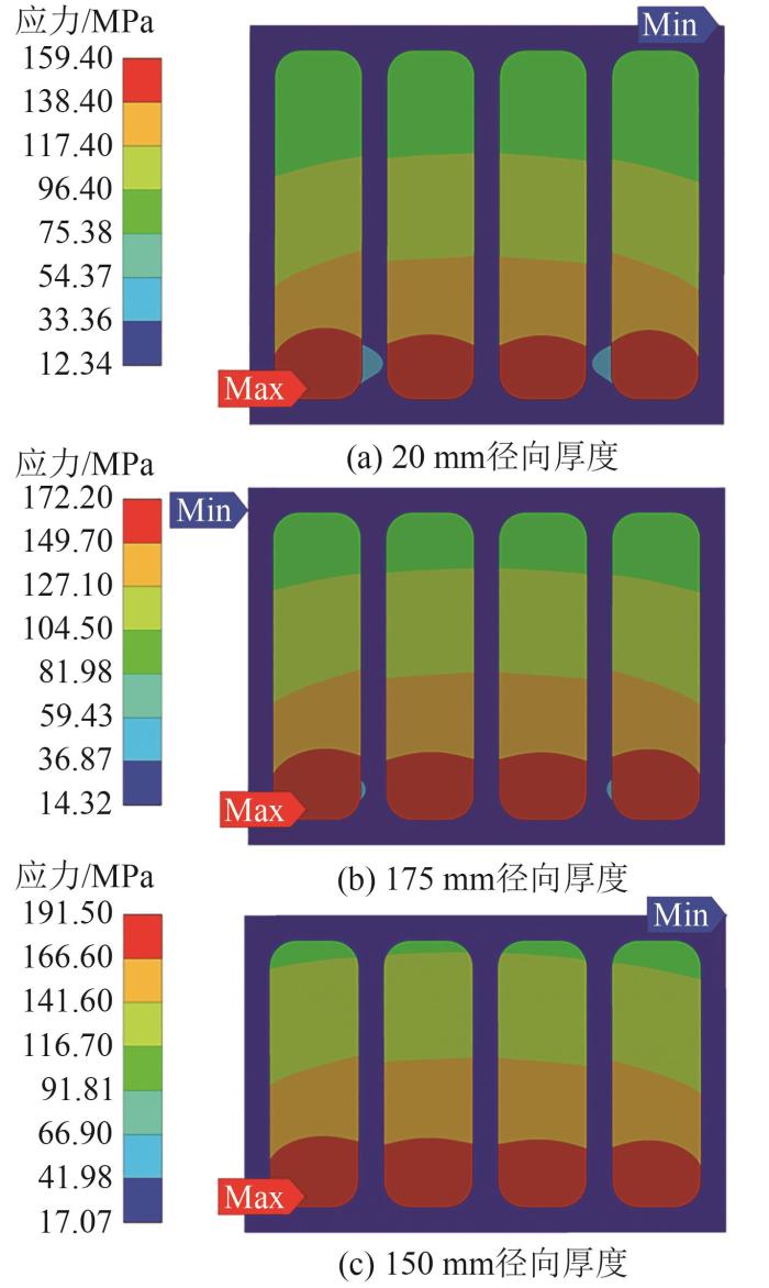 由表4可见,不同径向厚度下中部线圈组导体之间的最大径向应力与轴向应力相差无几,随着径向厚度由200 mm减少至150 mm,环向应力由140.12 MPa增加至173.41 MPa,这是由于中部线圈组呈现出两端向中间挤压、整体向外膨胀的趋势,而减少导体径向厚度对电磁力的影响不大,但线圈组向外膨胀的趋势愈发明显,这会导致导体在环向上的应变增加,进而环向应力增加。