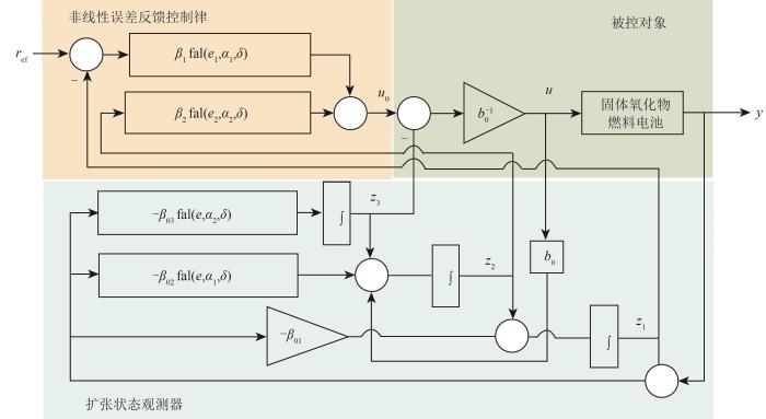 ADRC方法并不依赖于特定的模型,其主要结构由3部分组成:跟踪-微分器(tracking differentiator,TD)、非线性状态误差反馈控制律(nonlinear state error feedback,NLSEF)和非线性扩张状态观测器(nonlinear extended state observer,NLESO)。首先应用跟踪-微分器对输入的参考电压进行跟踪和滤波,然后应用非线性扩张状态观测器对SOFC系统的不确定性、未建模动态、外部扰动和控制系数的不确定性进行观测,最后将两者的输出信号输送至非线性误差反馈控制律中,经运算后得到天然气流量信号。
