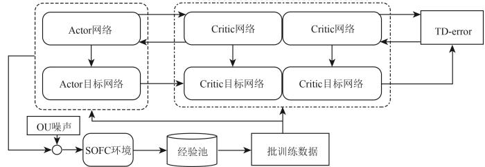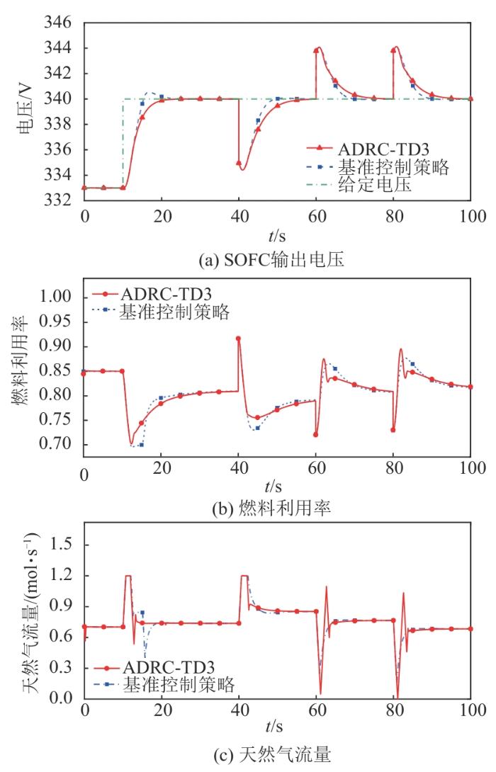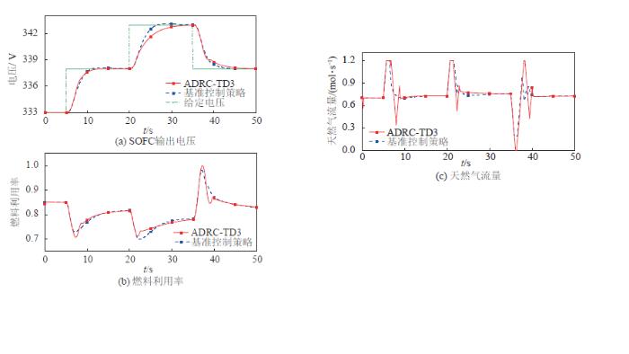 Objectives In order to improve the performance and lifetime of solid oxide fuel cell (SOFC) systems, the 100 kW SOFC system was taken as the research object. The continuous adjustment of the controller coefficients was explored through reinforcement learning to realize the best comprehensive performance, while ensuring the output voltage tracking performance. Methods A mechanism-based SOFC output voltage system model was established, an improved nonlinear active disturbance rejection controller (NLADRC) was used to make the output voltage track the reference value well by controlling the input gas flow. Conventional single-channel controllers can only satisfy one objective at a time, and dual-channel controllers will increase system complexity, cost and risk of failure. An improved NLADRC controller based on the twin delayed deep deterministic policy gradient (TD3) was proposed to optimize the coefficients of nonlinear error feedback control law. Results The designed controller can improve SOFC output voltage tracking performance without violating fuel utilization constraints. Conclusions The designed controller has the advantages of strong adaptability, high stability, and the ability to overcome uncertainty, providing theoretical reference for designing output voltage controllers in practical SOFC systems.