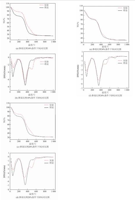 Experimental and theoretical TG-DTG curve of blending under different blending ratios