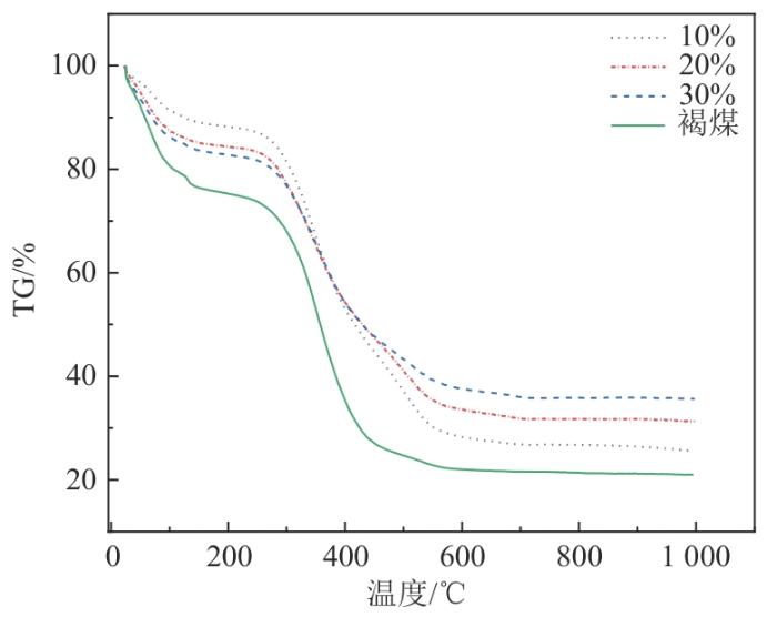 不同比例掺混在20 K/min升温速率下的TG曲线