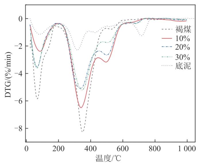 不同比例掺混在20 K/min升温速率下的DTG曲线