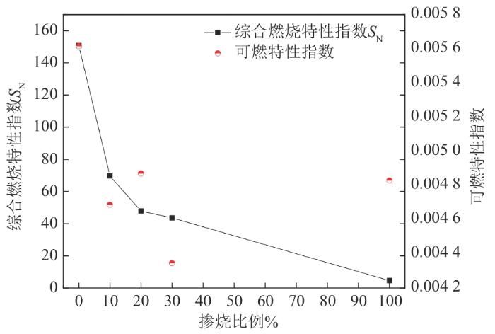 由图10可知,随着掺混比例增加,可燃特性指数增加,说明掺烧一定量的底泥可以改善煤的着火性能,有利于煤的稳定燃烧,但当比例达到30%时,指数明显减小,说明掺烧比例过大时,不利于改善燃料的燃烧性能。