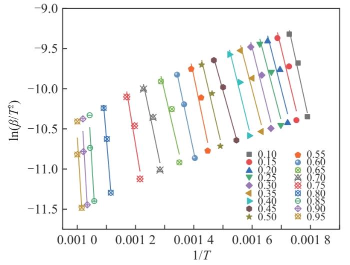 式中G(α)为f(α)的积分形式,根据所得方程,设X为1/T,Y为ln(β/T2),拟合方程,根据斜率-
