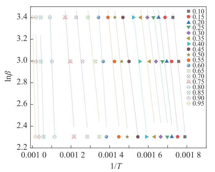根据所得方程,设X为1/T,Y为lnβ,拟合方程,根据斜率-1.056 1Ea/RT求得表观活化能Ea。