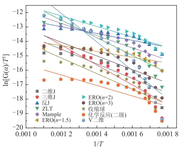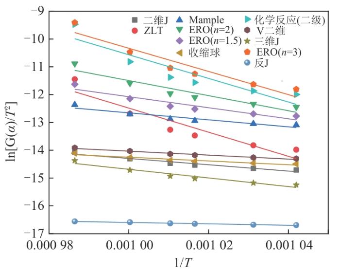 式中G(α)为f(α)的积分形式,根据所得方程,设X为1/T,Y为ln[G(α)/T2],拟合方程,根据斜率Ea/RT求得表观活化能Ea。将求得的Ea与前2种方法求得的各阶段Ea进行对比,验证反应机理函数的准确性,Ea最接近的为该阶段的反应机理函数。
