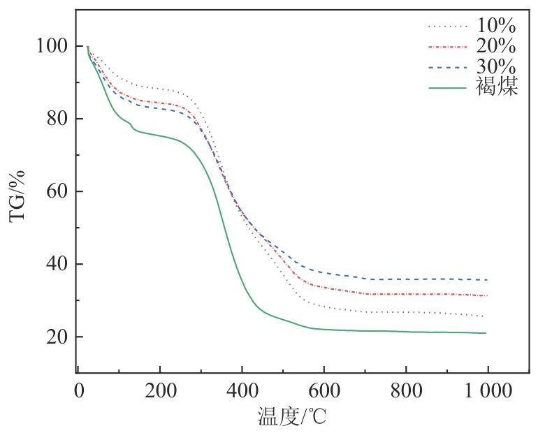 | 图7 不同比例掺混在20 K/min升温速率下的TG曲线 |