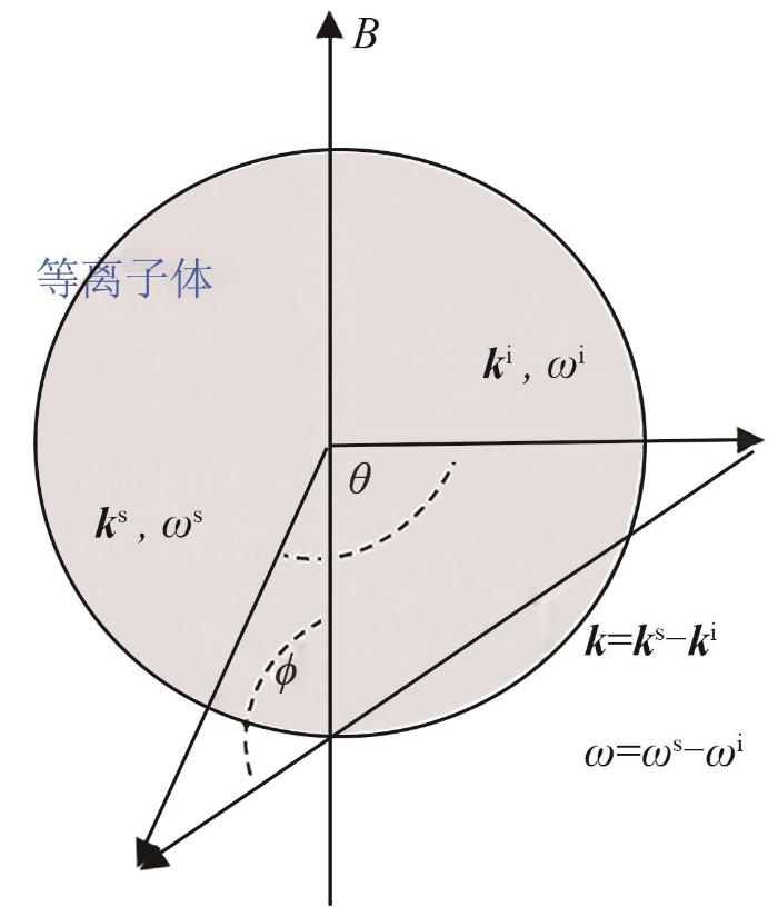 扰动波矢具体可由散射几何来定义,如图1 所示。其中 k i 、ω i , k s 、ω s , k 、ω 分别为入射波束、散射波束、扰动波束的波矢和角频率,单位分别为m-1 和rad/s; B 为装置磁场,单位为T;θ 为入射波矢与散射波矢之间的夹角;ϕ 为磁场与扰动波矢之间的夹角。