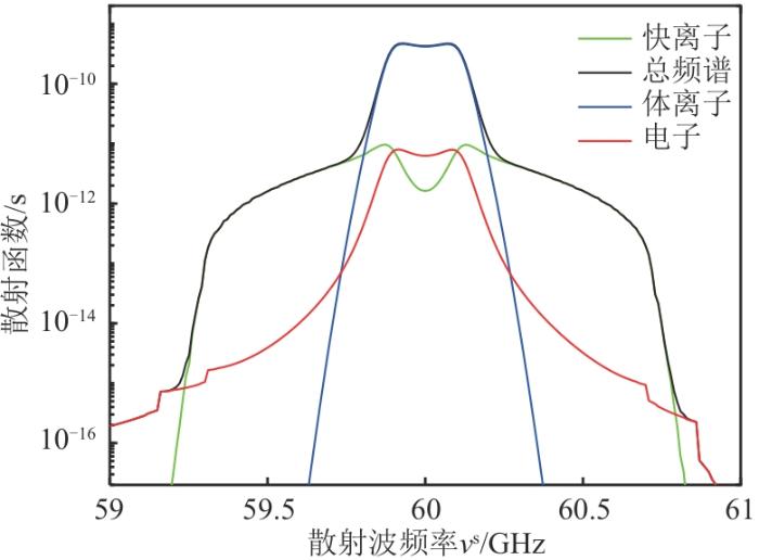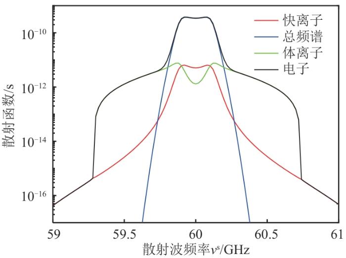 式中:C 为散射函数的计算系数;ω pe 为电子等离子体频率,rad/s;ω i 和ω s 分别为入射波和散射波频率,rad/s;ζ i 和ζ s 分别为入射辐射和散射辐射的归一化通量;α ˜ i ( a ) 、 β ˜ j ( a ) 均为粒子种类a 的扰动量;G ^ i ( α ) 和G ^ j ( β ) 分别为扰动量α 和β 的介电耦合算符;上标*表示复共轭。