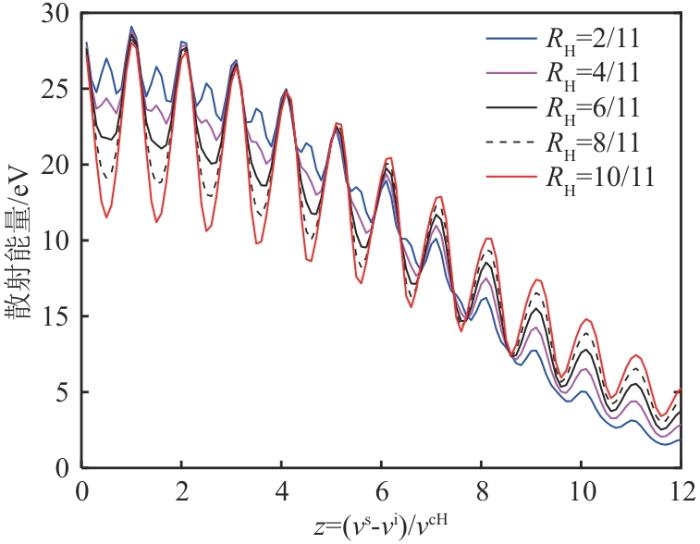 从图4 中可以看出,密度分量不再完全成为总散射函数的主要成分。在散射波频率小于60.2 GHz时,密度扰动占主要成分;在60.2~60.4 GHz,多种成分一起构成了散射函数;在大于60.4 GHz后,电流密度的扰动占散射函数的主要成分,散射函数的峰值在60.47 GHz处,此处静电模型与全电磁模型的散射函数强度上相差接近1个数量级。由此可见,只有全电磁模型可以正确处理这种特殊的CTS频谱结构。图4 中低频率出现的频谱振荡情况是源于离子-伯恩斯坦波模式,而频谱峰值出现在60.47 GHz处是源于快磁声波[7 ] 。CTS频谱中的离子-伯恩斯坦波结构及离子回旋结构是诊断托卡马克装置及聚变堆的离子比例的基础,图5 为全电磁模型CTS散射功率谱随H离子含量变化而产生的不同结构,参数来源于TEXTOR装置CTS系统[15 ] ,如表2 所示,其中R H = n H / n e ,其中n H 为H离子的密度,m-3 ,离子种类为D-H等离子体,图5 横坐标Z = v s - v i / v c H 表示扰动波频率相比离子回旋频率的谐波次数,其中,v i 、v s 和v c H 分别表示入射波频率、散射波频率和离子回旋频率,GHz。