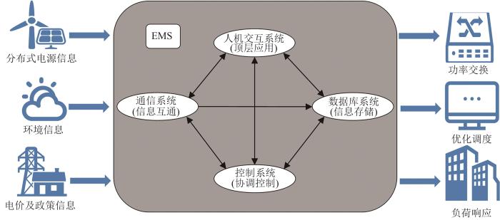 ... 孤岛微电网能量管理系统(energy manage system,EMS)是一套集发电优化调度、负荷管理、实时监测与自动实现微电网同步等功能于一体的综合管理系统[24].其在预测可再生能源机组发电、优化燃料机组发电、控制储能充放电、调整可控负荷以及维持系统稳定等方面发挥重要作用.一套完整的EMS由控制系统、通信系统、数据库系统和人机交互系统四大模块构成[25],如图2所示,箭头所指方向即为数据和信息的流动方向.部分外部信息经数据接口传递至微电网能量管理系统,通过与数据库系统的数据进行对比分析后,向控制系统下达命令并执行相应操作,同时也通过接口与分布式电源交换信息,共同实现微电网的能量管理功能. ...