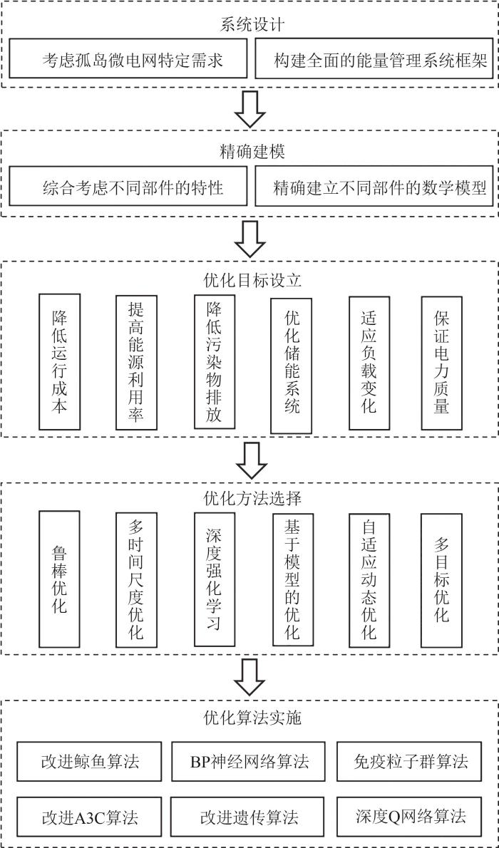 ... 选取先进算法是实现孤岛微电网能量管理策略的重要保障,结合优化方法,可以显著提升微电网能量管理系统的效率和稳定性.目前,改进鲸鱼优化算法、反向传播(back propagation,BP)神经网络算法以及粒子群算法等求解优化问题的有效算法,已在微电网的能量管理中得到了广泛应用.为实现分布式能源的合理优化配置,以达成更经济和环保的目标,文献[61]提出了一种基于阿基米德混沌精英鲸鱼优化算法.而文献[62]则通过整合全年风速、太阳辐照度和负荷等数据,并结合创新的强化学习神经网络算法,在降低系统运用成本的同时,还提高了系统可靠性,为孤岛微电网能量管理系统提供了有价值的见解.在微电网容量优化方面,文献[63]根据气象和负荷信息,运用改进的免疫粒子群算法对混合储能的容量进行了优化,从而提高了微电网运行的经济性和稳定性.由此可见,在孤岛微电网运行优化过程中,一旦确定了目标函数和约束条件,优化算法的优劣将直接决定最终的优化效果. ...