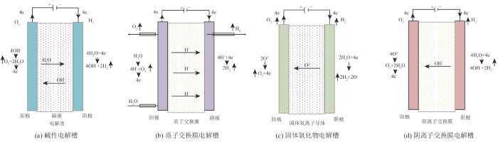 电解水制氢是一种利用电能将水分解为氢气和氧气的过程。这一技术因其对化石燃料依赖性低、排放清洁而被认为是最有前景的绿色制氢途径之一。目前,电解水制氢技术主要包括4种类型的电解槽:碱水电解槽(alkaline water electrolyzer,AWE)、质子交换膜电解槽(proton exchange membrane water electrolyzer,PEMWE)、固体氧化物电解槽(solid oxide electrolysis cell,SOEC)和阴离子交换膜电解槽(anion exchange membrane water electrolyzer,AEMWE)[20]。