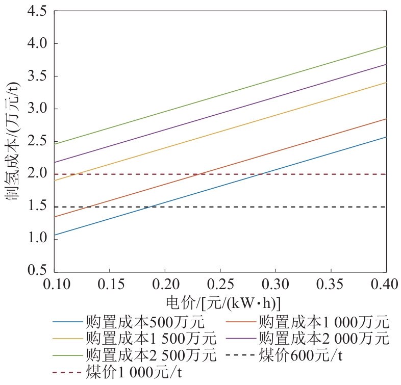 | 图5 不同电解槽购置成本下PEM制氢成本与可再生能源电价关系 |
