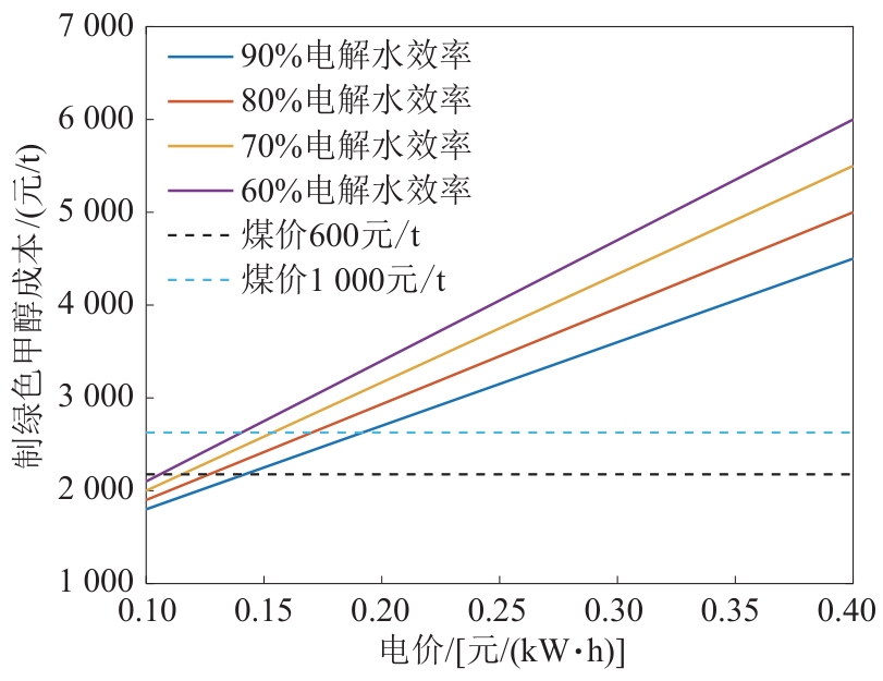 | 图7 不同制氢效率下制绿色甲醇成本与可再生能源电价关系 |