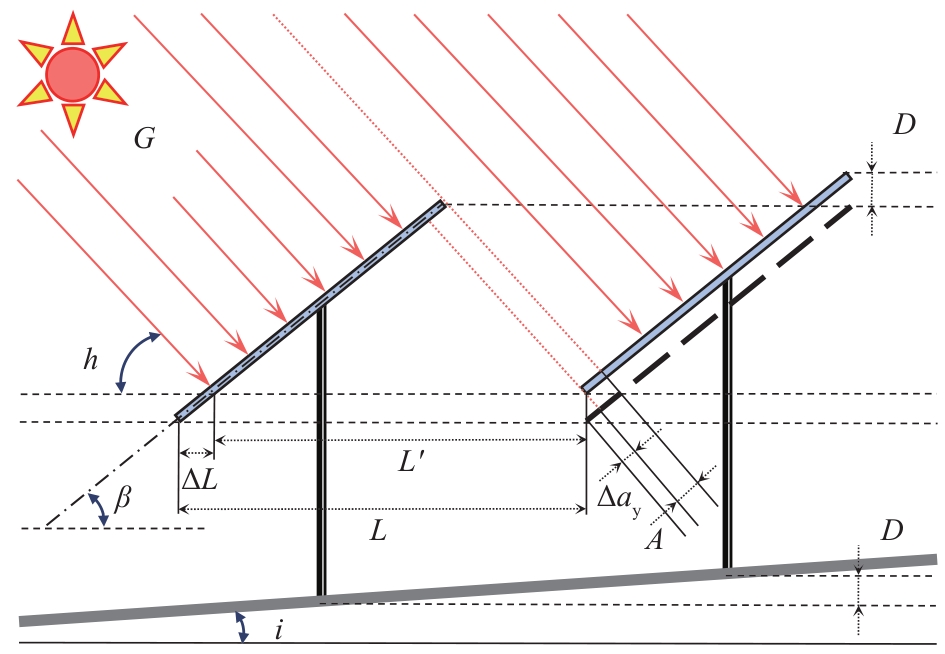 | Fig. 6 Schematic diagram for calculating shadow size of gently sloping PV arrays |