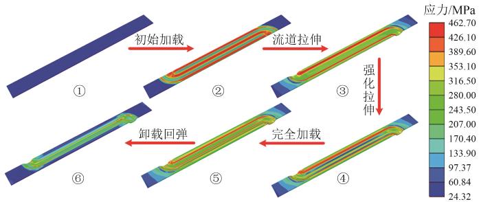 图4为液压成形过程中钛双极板应力变化,分为6个阶段:①未变形时自然状态阶段;②初始加载阶段;③流道拉伸阶段;④强化拉伸阶段;⑤完全加载阶段;⑥卸载回弹阶段。