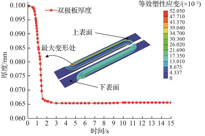 图7为双极板成形过程中的等效塑性应变和厚度变化。上表面肋部末端是等效塑性应变最大处,随后向外倒角部分蔓延,外倒角到流道侧壁之间塑性变形较小,由于双极板底部与模具接触,直流道中心存在小部分塑性应变;下表面直流道塑性应变均匀,且变形不剧烈。通过提取肋部末端等效塑性应变最大处厚度变化,可知该处厚度随液压力增大而迅速减小,卸载时板料厚度略微增加,这是由卸载后回弹引起的。