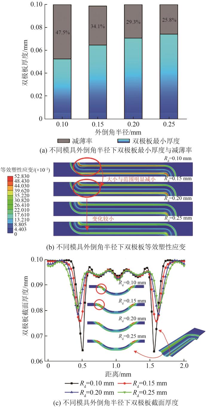 2)外倒角半径不超过0.20 mm时对双极板减薄率有较大影响,超过0.20 mm时影响减弱,因此外倒角半径应不小于0.20 mm。