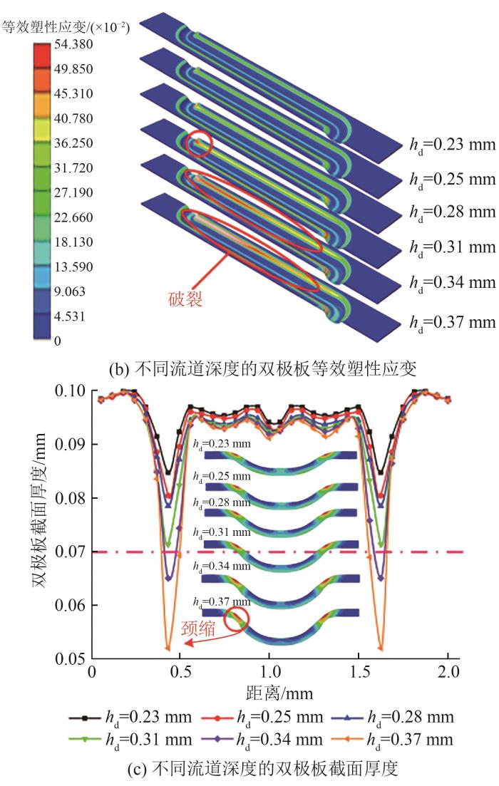 双极板流道深度越深,单位时间内通过的反应气体体积越大,燃料电池功率越大。但深度越大的双极板成形越困难,极易导致材料被拉裂。