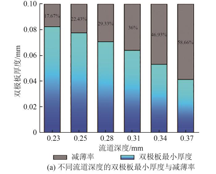 4)流道宽度影响双极板整体塑性变形,增大宽度可以增加流道厚度,当流道宽度和肋宽接近时,最大减薄率最小。