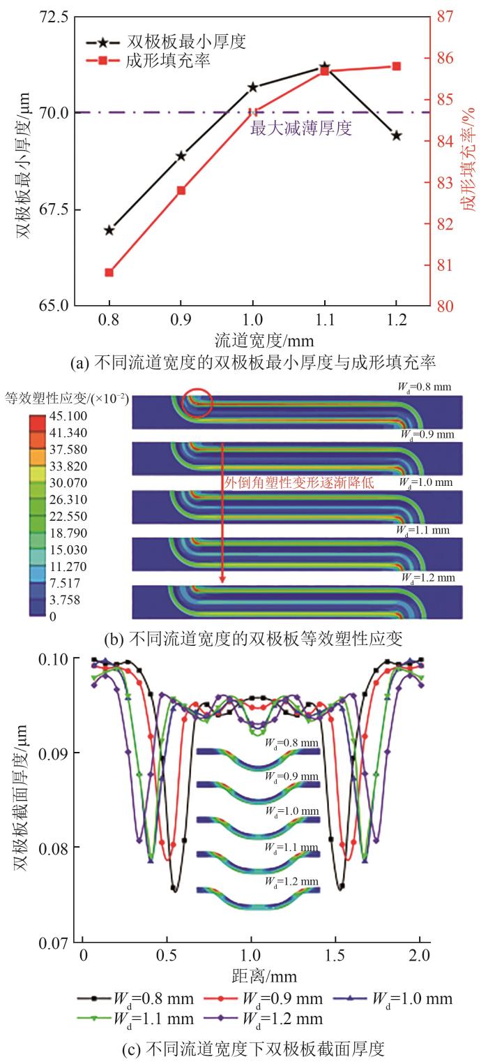 由图10(c)可知,当Wd=0.8 mm时,流道底部成形后为圆弧形,流道中心内层基本未发生塑性变形,流道外倒角减薄率为25%。随着Wd增加,外倒角部分变形变化很小,流道内倒角塑性变形与其他部分趋势相同。流道宽度增加后,塑性区主要转化为流道底部中心区域的增长。当Wd>0.8 mm时,各部位厚度基本不变,流道底部厚度为0.95 mm,随着Wd增加,流道中心区宽度越来越大,但厚度基本相同,表明流道宽度对外倒角产生影响,并不影响流道中心质量。