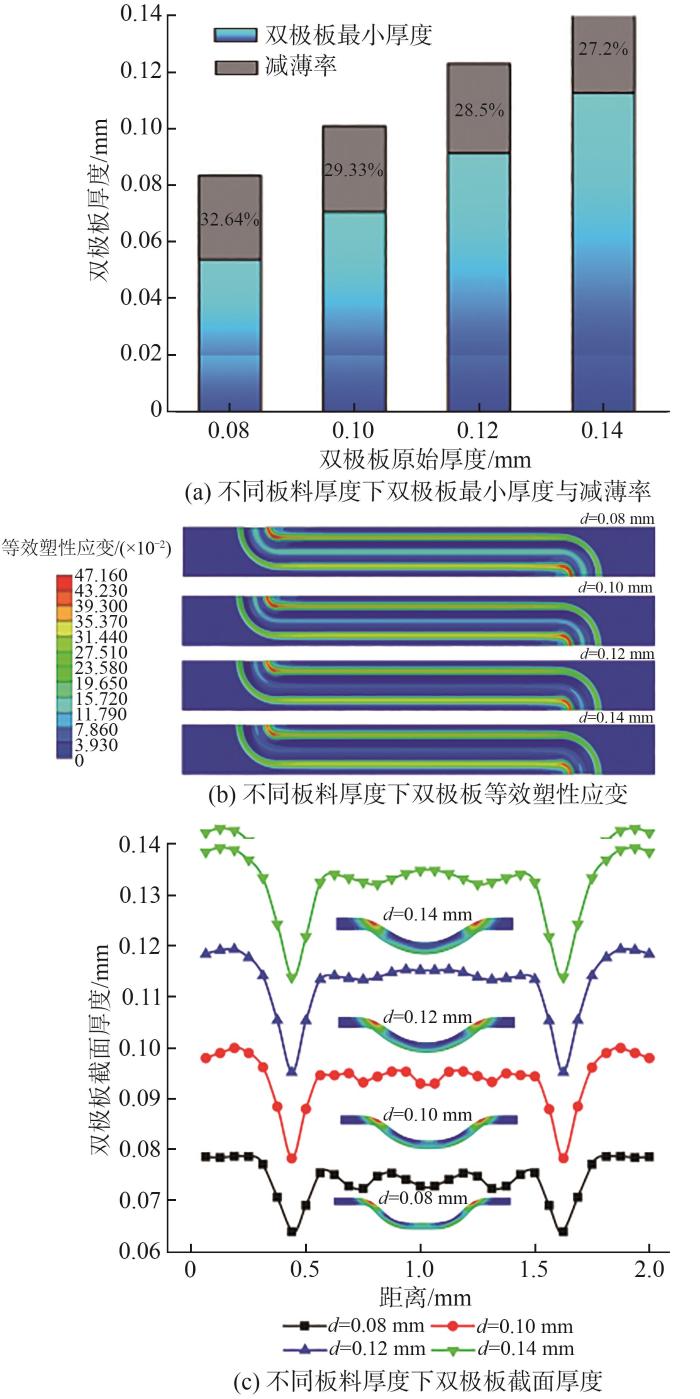 由图11(c)可知,当d=0.08 mm时,板料强度较小,流道塑性变形明显,流道底部接触模具面积较大,厚度波动规律,流道底部厚度和内倒角厚度约为0.75 mm。随着板料厚度增加,成形趋势基本未发生变化,流道中心厚度变化较大,塑性分层较为明显,内倒角处塑性变形始终较小,中间区域塑性变形随板料厚度增加而减小。底部成形后为圆弧形,表明厚度越大,越难成形。