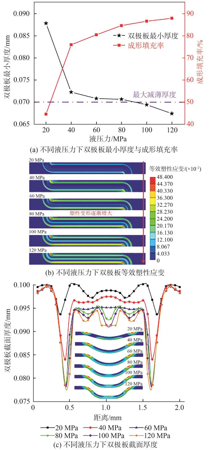6)增加液压力可以提高填充效果;液压力对双极板最大减薄率影响较大,当液压力增大到一定程度时,其对直流道外倒角减薄率影响减小。